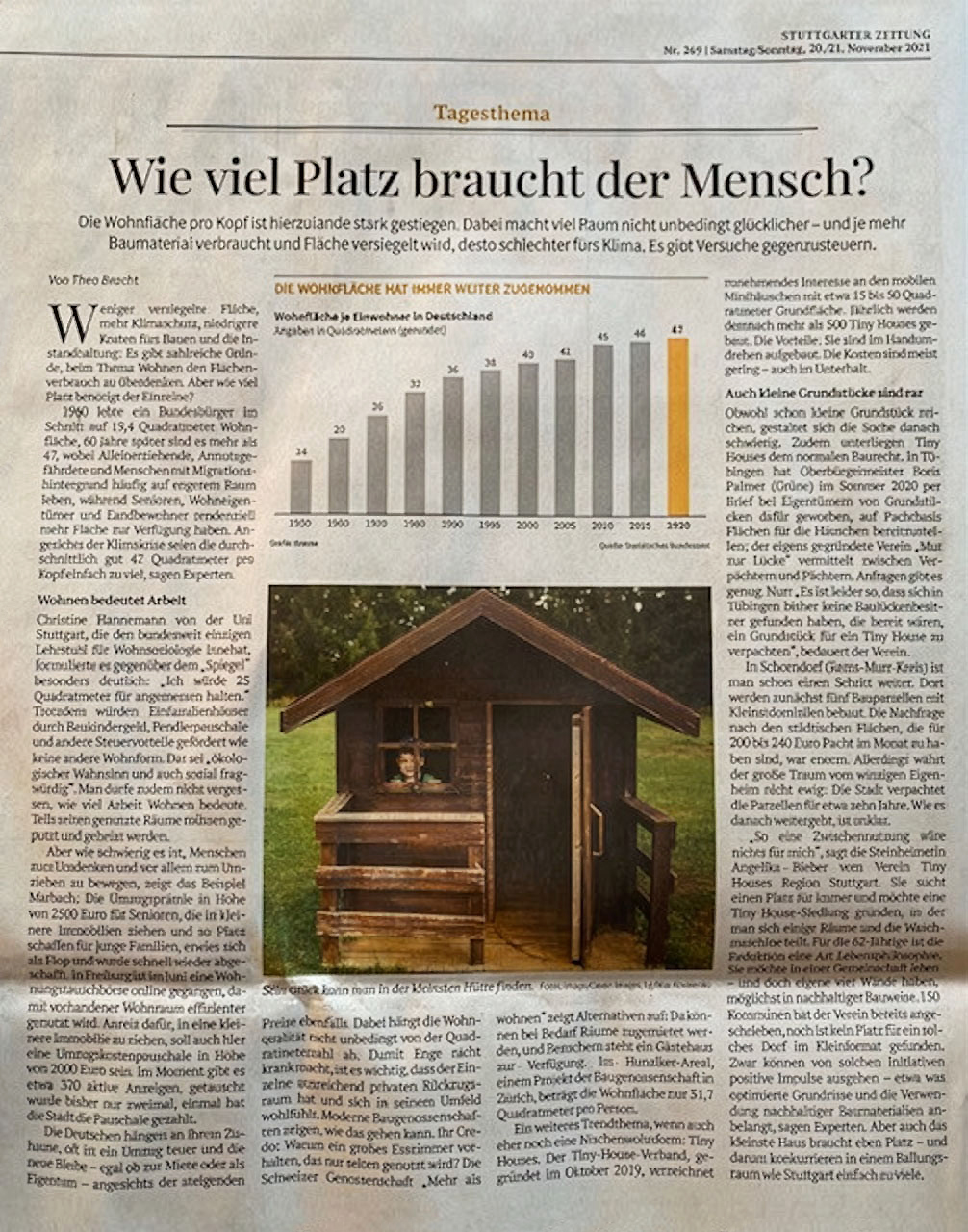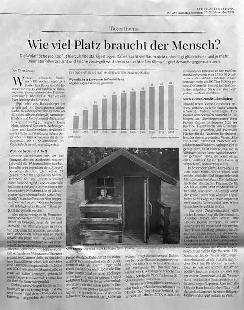 Stuttgarter Zeitung, Nr. 269 vom 20./ 21.11.2021 – „Wie viel Platz braucht der Mensch?“: ” Christine Hannemann von der Uni Stuttgart, die den bundesweit einzigen Lehrstuhl für Wohnsoziologie innehat, formulierte es gegenüber dem “Spiegel” besonders deutlich: “Ich würde 25 Quadratmeter für angemessen halten.” Trotzdem würden Einfamilienhäuser durch Baukindergeld, Pendlerpauschale und andere Steuervorteile gefördert wie keine andere Wohnform. Das sei “ökologischer Wahnsinn und auch sozial fragwürdig”. Man dürfe zudem nicht vergessen, wie viel Arbeit Wohnen bedeute. Teils selten genutzte Räume müssen geputzt und geheizt werden.” Zum Artikel Zum Online Artikel